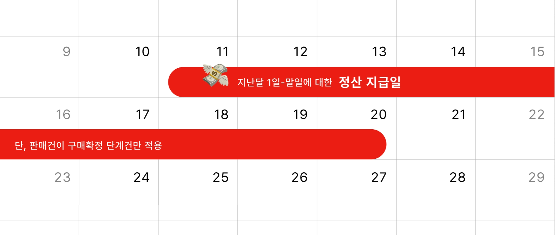 (매월 1일-말일건에 대한) 판매건의 구매확정일 기준으로 익월 11일 ~ 20일에 정산되며,